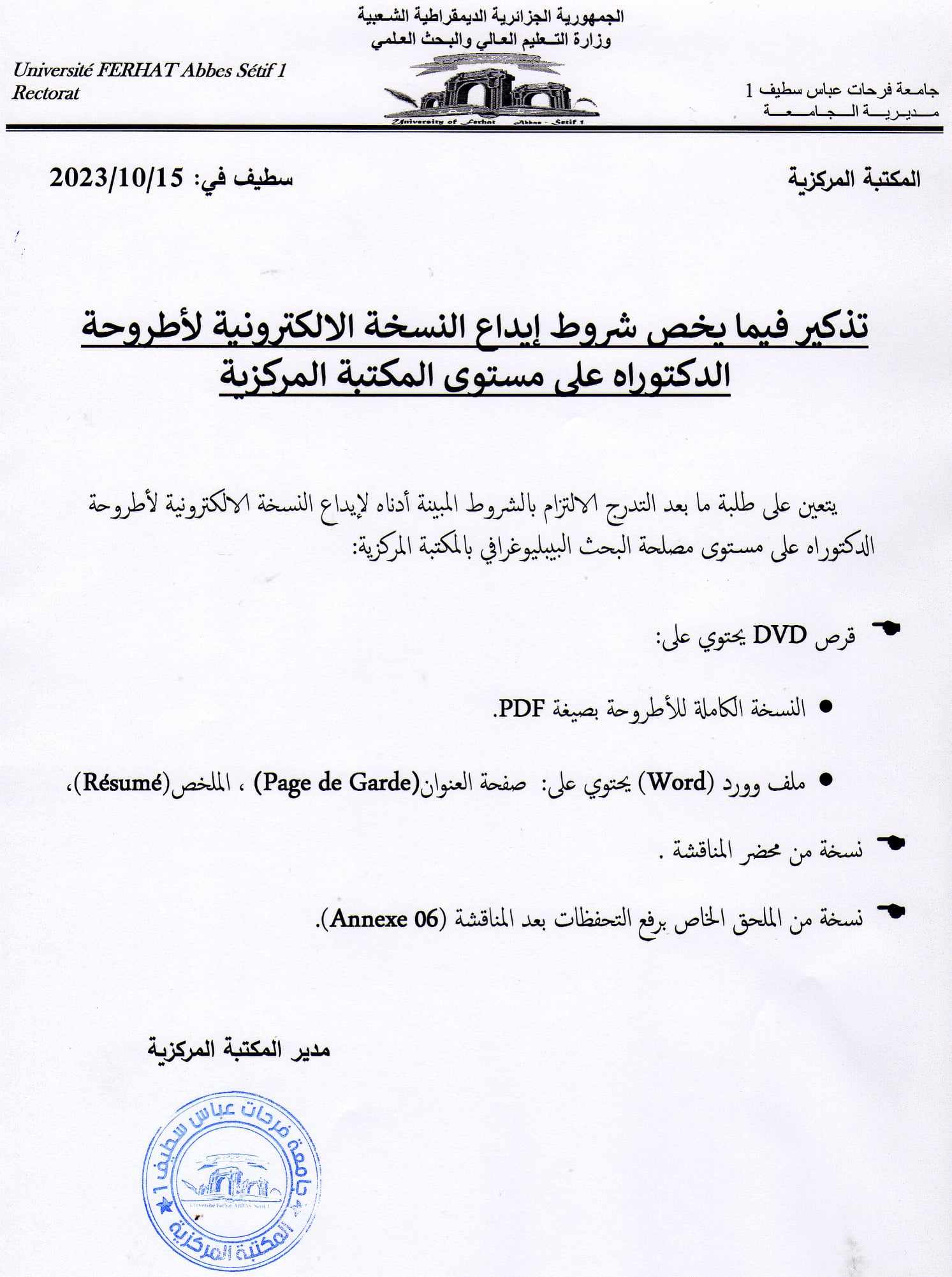 La Bibliothèque Centrale de l’Université de Sétif 1 a dans une note rappelé les modalités de dépôt de la version électronique des thèses de doctorat au niveau du service de recherche bibliographique.